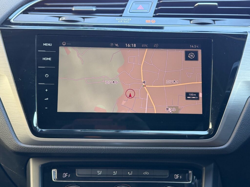 VW純正の大型インフォテインメントシステム「ディスカバープロ」が標準装備されており、バックカメラも搭載済み。全長4,527mmのボディを持つゴルフトゥーランは、慣れるまで後退の感覚がつかみにくいこともありますが、バックカメラがあれば安心です。後付けナビとは異なり、メーター類との連携やステアリングスイッチでの操作など、純正ならではの使い勝手の良さも魅力です。