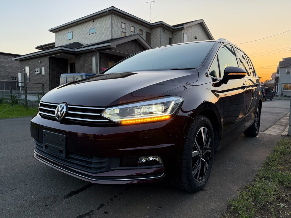 ゴルフトゥーランTDIプレミアムは2019年10月に500台限定で発売された特別仕様車です。新車価格は476万5,000円でした。現在の中古車市場では、2020年式TDI系(走行距離や仕様による)でおおむね220万〜360万円前後での流通が見られます。今回の個体は走行7,300kmという極めて少ない走行距離に加え、国内100台限定のクリムゾンレッドカラー×DCC・テクノロジーパッケージ全装備という希少な組み合わせであるため、相場より高い価値を持つ1台です。