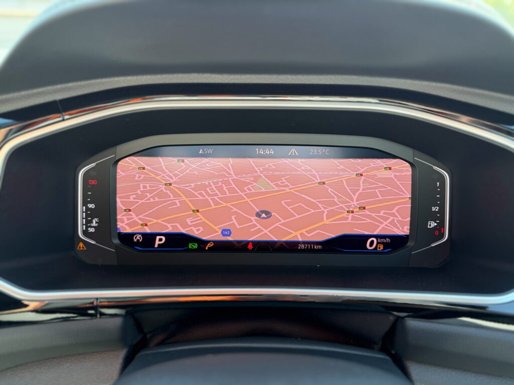 Rラインはフォルクスワーゲンにおけるスポーツグレードの名称で、専用バンパー・専用ハーフレザーシート・大径アルミホイールなど、ベースグレードとは一線を画す外装・内装を標準装備しています。さらに本車両はDigital Cockpit ProとDiscover Proナビが搭載されており、スポーティな走りと上質な室内空間を両立しています。